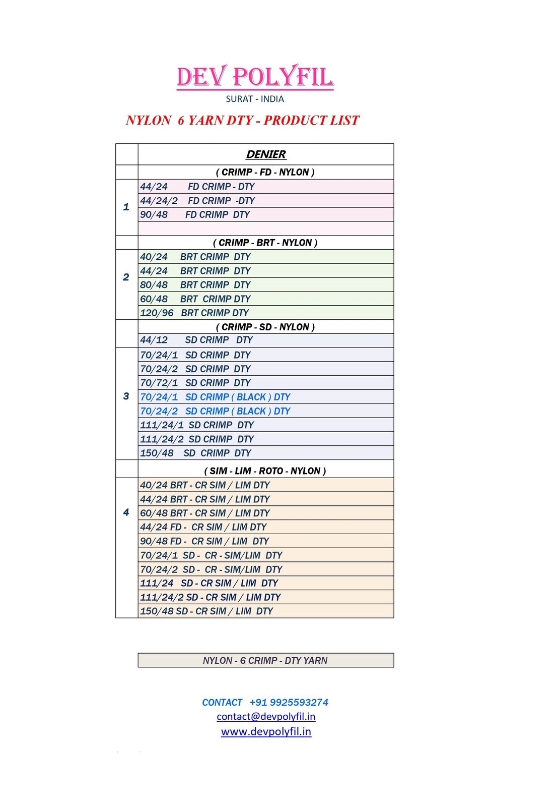 Nylon Crimp Yarn from 20 deniers to 300 deniers in various as per the requirement of customers.